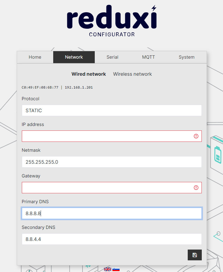 Since the DHCP protocol for assigning the IP of EVIO Gateway is set as the default protocol, we strongly recommend setting the static IP of EVIO Gateway. Go to Network settings/Wired network choose protocol to STATIC and set other parameters:
